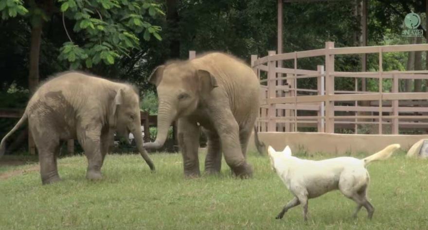 Τα μικρά ελεφαντάκια Pyimai και Chaba είναι πολύ περίεργα για τα σκυλιά που έρχονται να τα επισκεφτούν στην περιοχή τους στο Elephant Nature Park, αλλά δεν είναι τόσο σίγουροι για το τι να κάνουν με τα τριχωτά πλάσματα.
