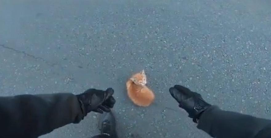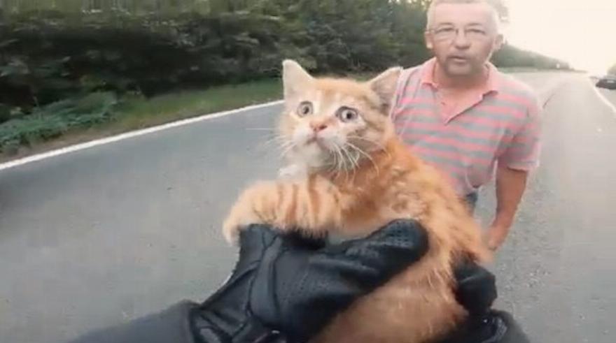 Ο μοτοσικλετιστής, που από ορισμένα δημοσιεύματα αναγνωρίζεται ως “Quentin”, οδηγούσε τη μοτοσικλέτα του στη Μονς του Βελγίου όταν εντόπισε το γατάκι. Σταμάτησε γρήγορα στην άκρη του δρόμου για να το σώσει και ένας άλλος άνδρας σε αυτοκίνητο σταμάτησε επίσης στην άκρη του δρόμου.