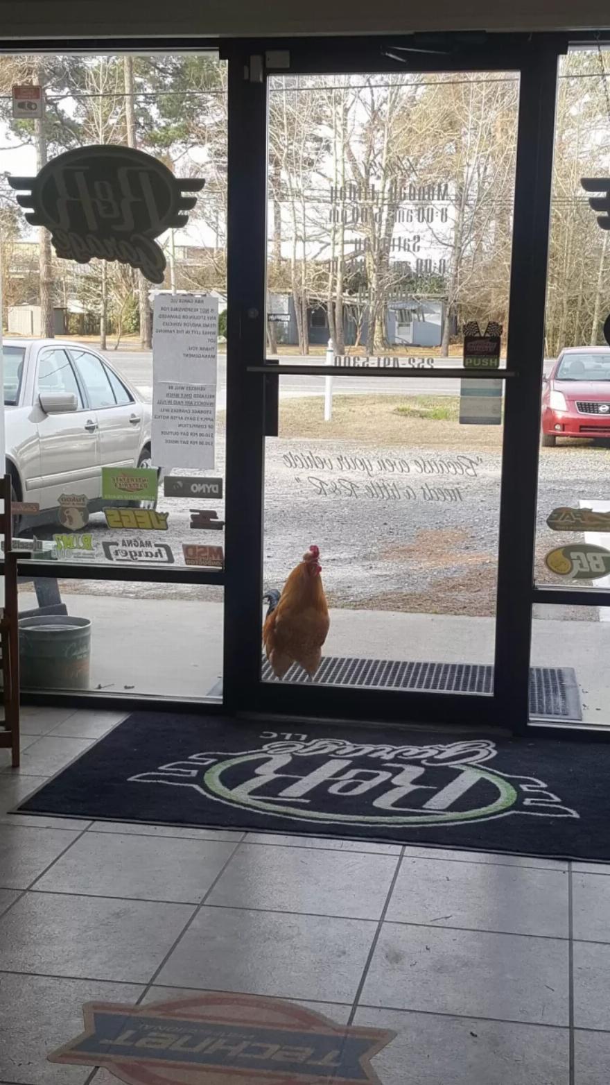 Ήταν μια συνηθισμένη μέρα πέρυσι το καλοκαίρι στο γκαράζ R and R στη Βόρεια Καρολίνα, όταν ένας κόκορας περιπλανήθηκε τυχαία στο γκαράζ και δεν φαινόταν να έχει σχέδια να φύγει. Οι εργαζόμενοι υπέθεσαν ότι τον είχαν εγκαταλείψει και άρχισαν να τον ταΐζουν με αποφάγια από το ψυγείο του συνεργείου, αλλά όταν πήραν ένα μακρύ Σαββατοκύριακο, κατά κάποιο τρόπο σκέφτηκαν ότι θα μετακόμιζε σε άλλο σημείο.