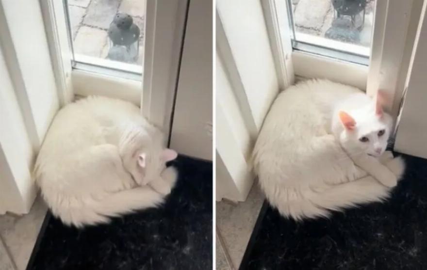 Ένας κουφός γάτος που κοιμάται στρατηγικά κοντά στην μπροστινή πόρτα έχει μαγέψει το διαδίκτυο.