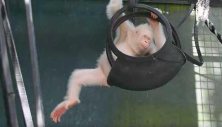 Τα θέματα υγείας που αφορούν ιδιαίτερα τα είδη αλμπίνο δεν φαίνεται να αποτελούν πρόβλημα για αυτό το αναιδές νεαρό πρωτεύον θηλαστικό, το οποίο κοιτάζει παιχνιδιάρικα προς τα κάτω τους φροντιστές που θέλουν να μάθουν πώς είναι.