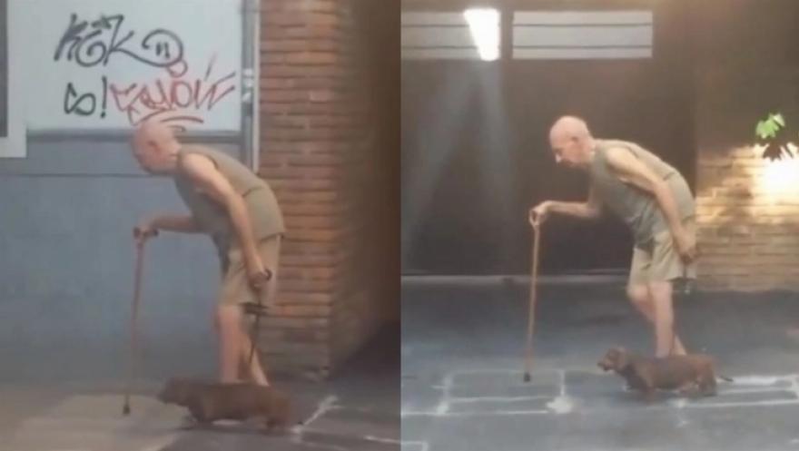 Μια συγκινητική επίδειξη αφοσίωσης και συμπόνιας, ο σκύλος περπατάει απίστευτα αργά, απηχώντας το βάδισμα του ηλικιωμένου άνδρα. Αυτή η συγκινητική στιγμή είναι μια υπενθύμιση του βαθύ δεσμού που μπορεί να υπάρχει μεταξύ ανθρώπων και σκύλων.