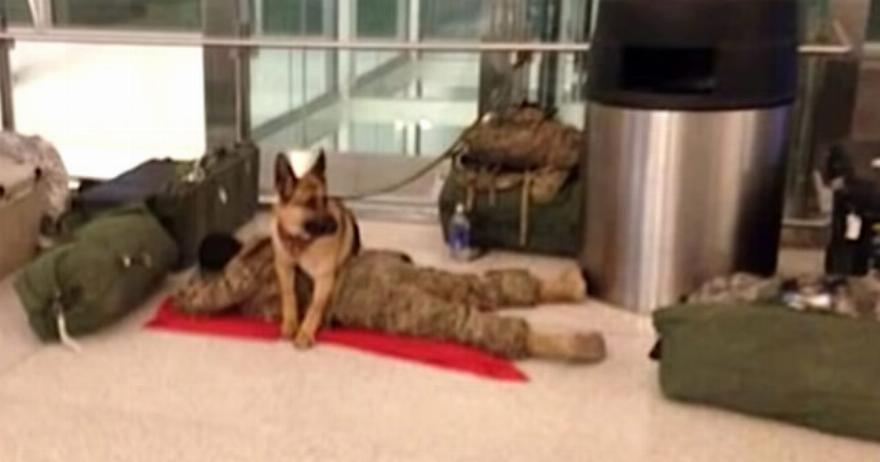 Σκύλος να προστατεύει έναν στρατιώτη που κοιμάται στο αεροδρόμιο