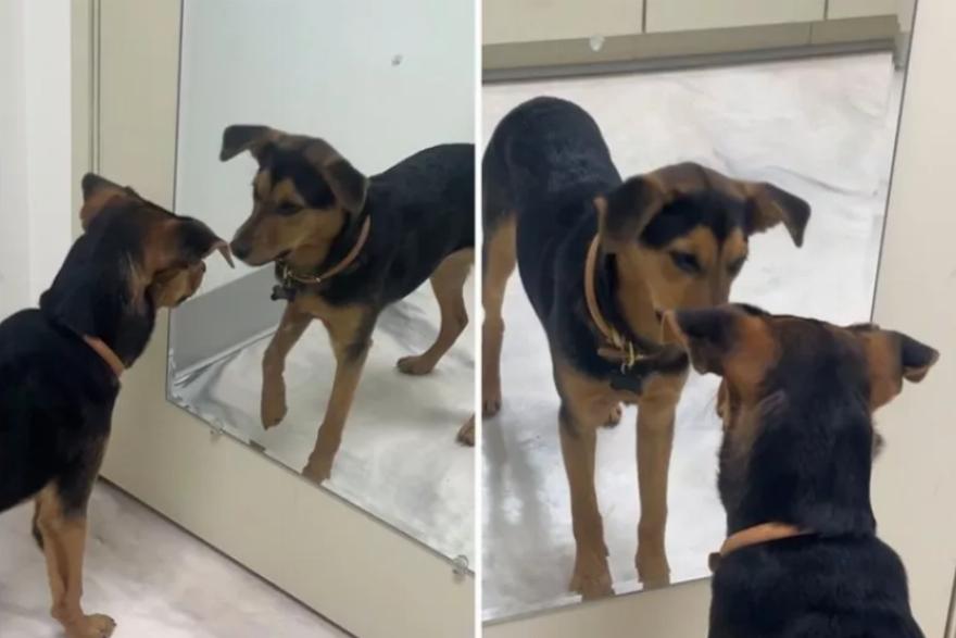 Ο Bear ο 7 μηνών σκύλος βρέθηκε μύτη με μύτη με τον “άλλο” σκύλο. Δεν μπορούσε να σταματήσει να χτυπάει τον καθρέφτη καθώς ήθελε να καταλάβει ποιος τον κοιτούσε πίσω. Μερικές δοκιμές μυρωδιάς αργότερα βγήκαν ασαφείς για το ποιος ήταν στον καθρέφτη.