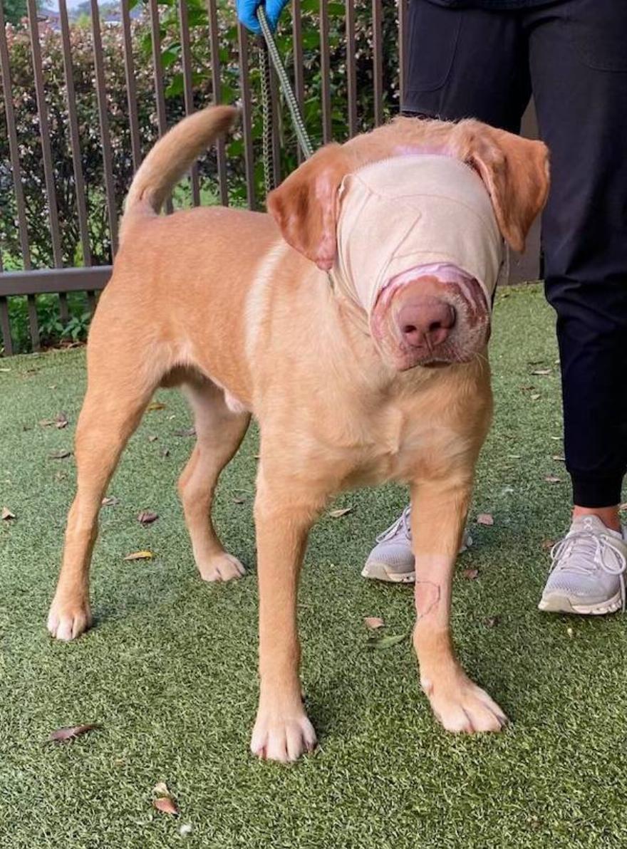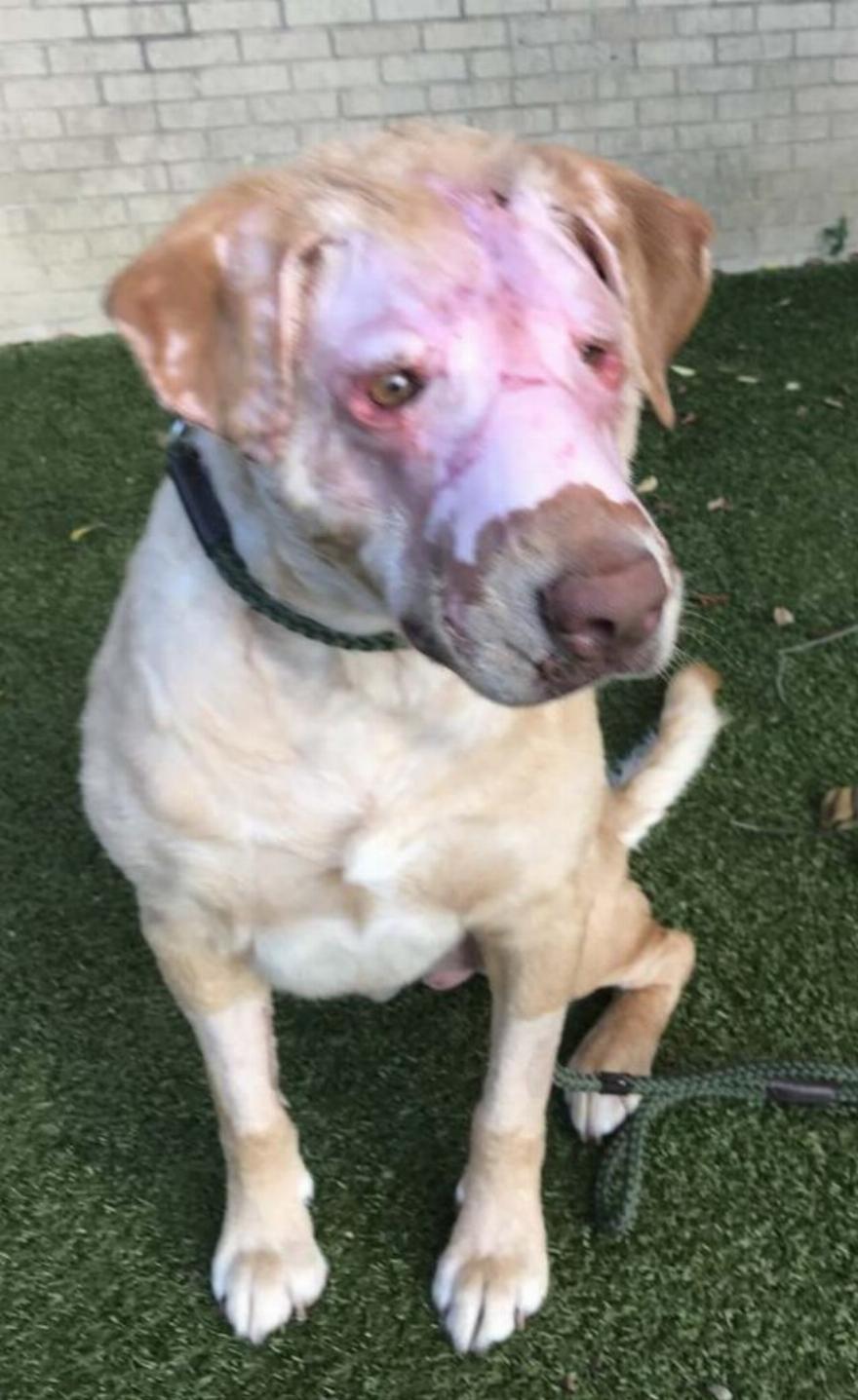 Ένας σκύλος που πυρπολήθηκε άγρια από έναν νεαρό, θεραπεύτηκε αρκετά ώστε να μπορεί επιτέλους να δει ξανά.