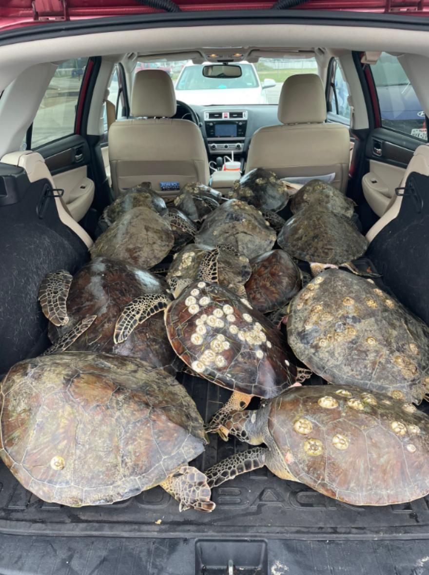 My mom is retired, & she spends her winters volunteering at a sea turtle rescue center in south Texas. The cold snap is stunning the local turtles & they’re doing a lot of rescues. She sent me this photo today of the back of her Subaru. It’s *literally* turtles all the way down. pic.twitter.com/xaDRNjLDoQ