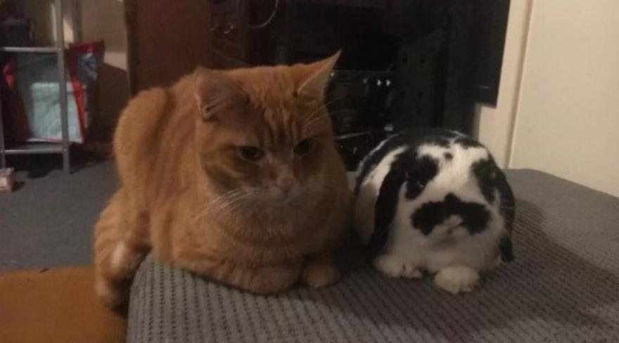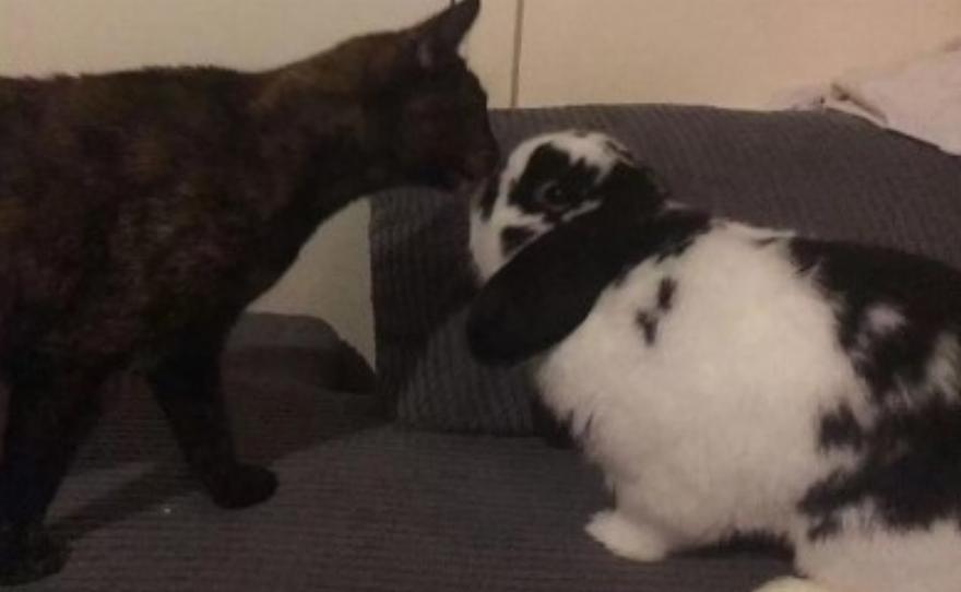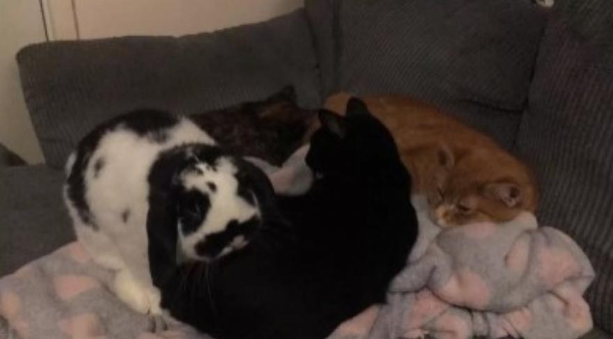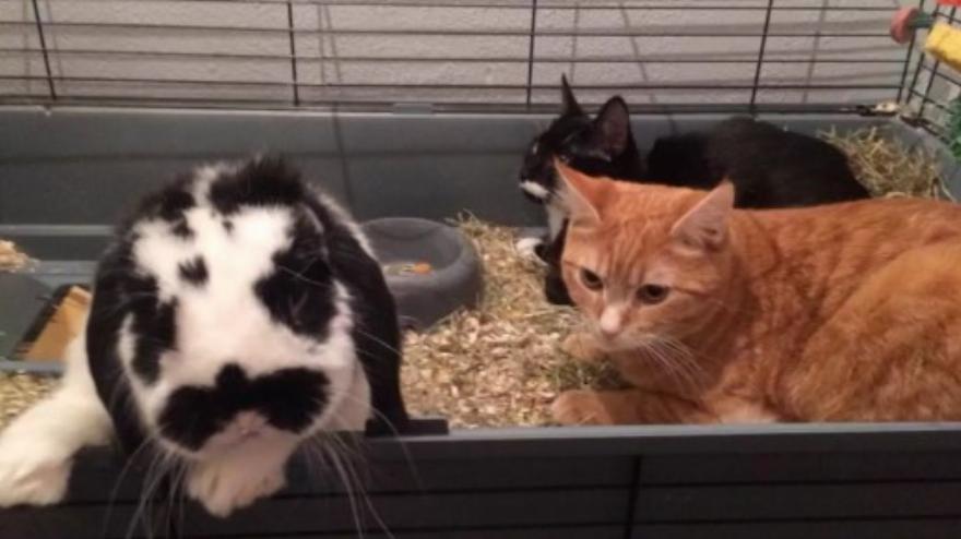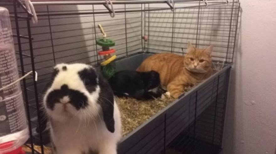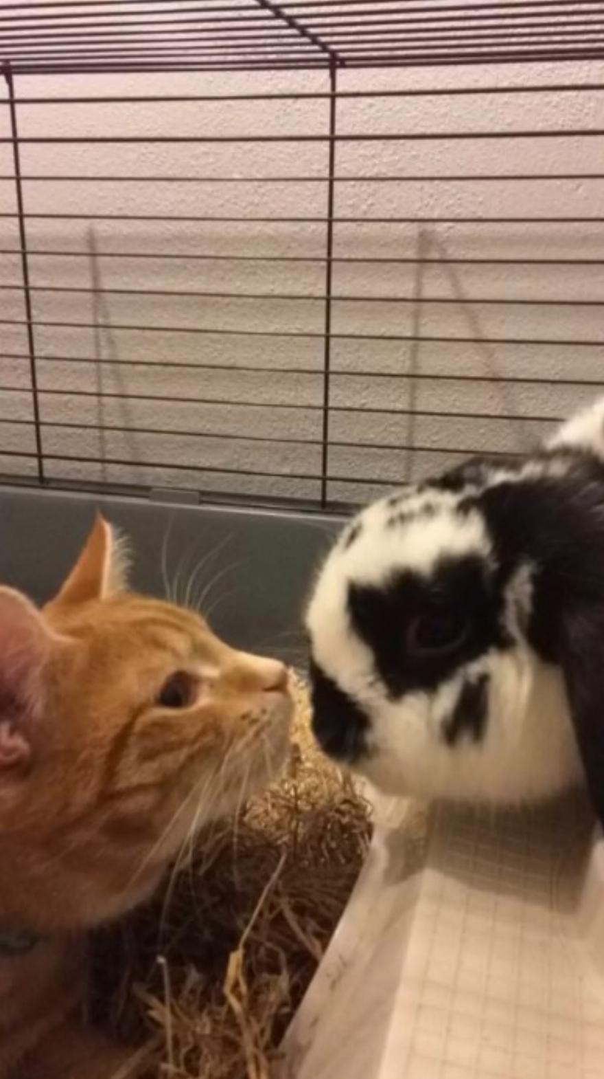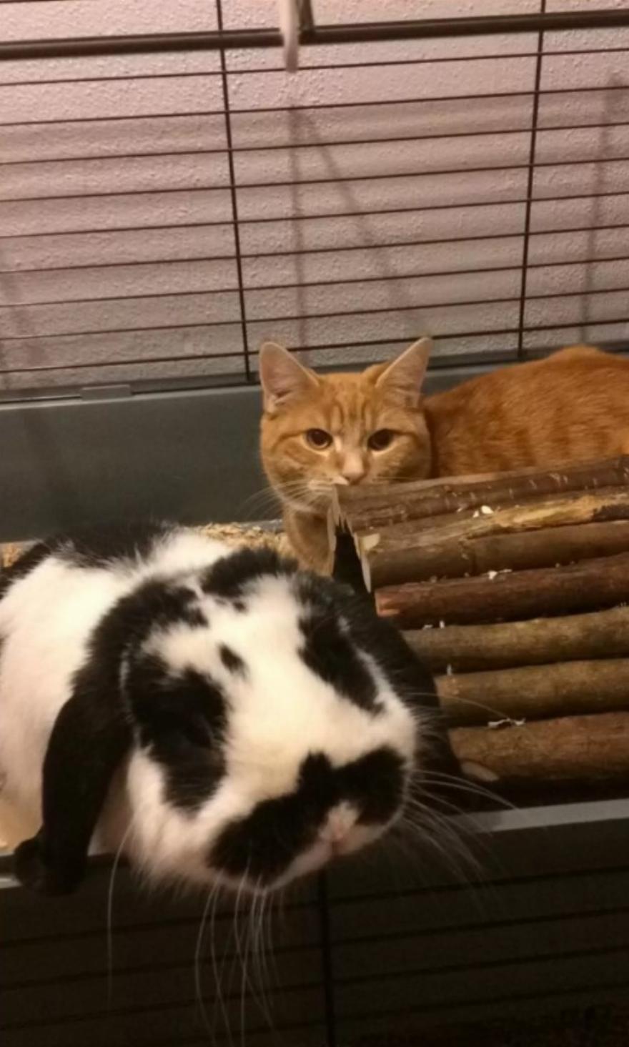 Μπορεί να φαίνεται παράξενο θέαμα, να βλέπεις ένα μάτσο γάτες να κάνουν παρέα σε ένα κουνελοτροφείο …