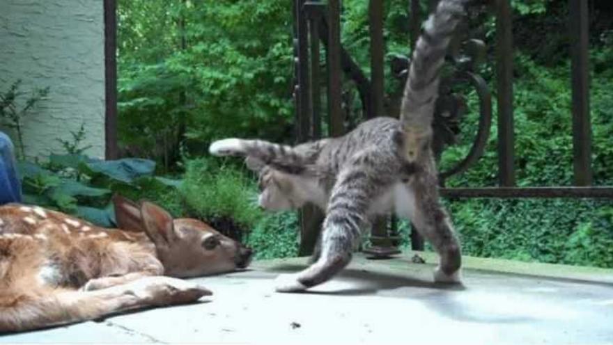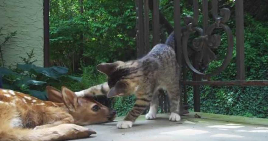 Μια τέτοια περίπτωση είναι ένα γατάκι που ενθουσιάστηκε όταν γνώρισε για πρώτη φορά ένα μικρό ελαφάκι.