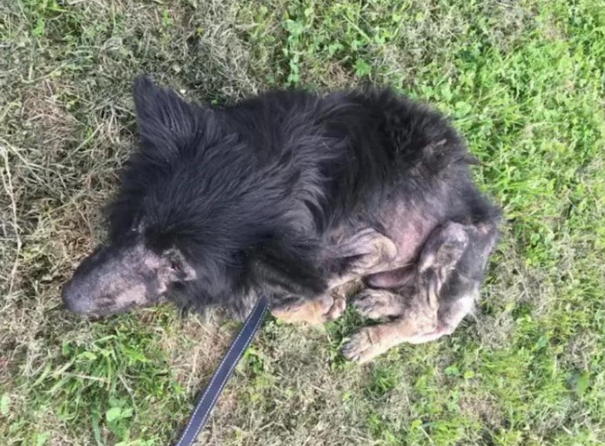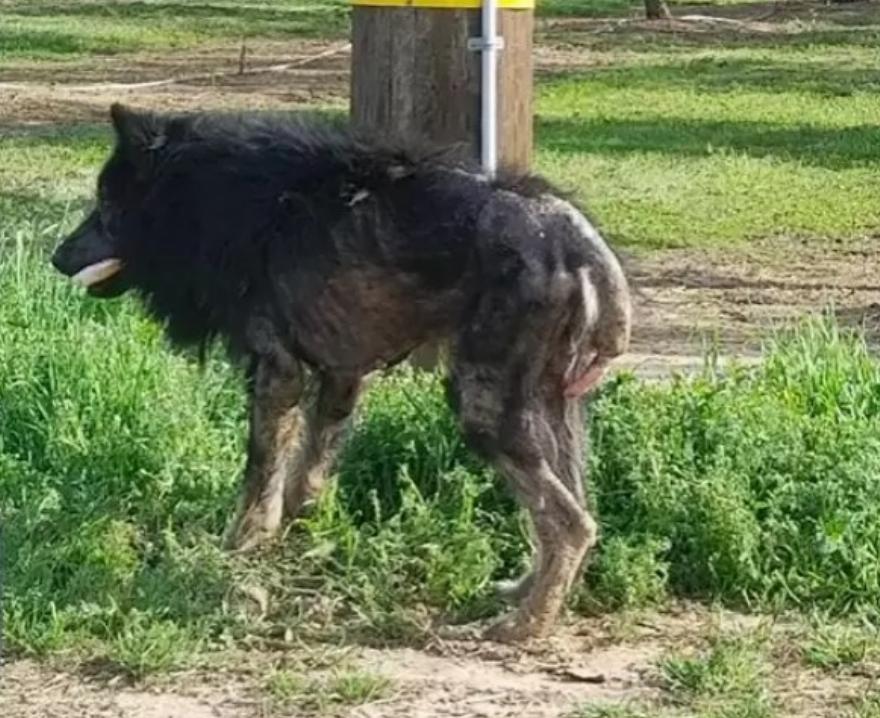 Στεκόμενος στην άκρη του δρόμου στο Madera Ranchos της Καλιφόρνια, ο αδέσποτος σκύλος ήταν καλυμμένος με ψώρα και καμπουριασμένος από τον πόνο. Το δέρμα του φαινόταν φολιδωτό και τα ατημέλητα μαύρα μαλλιά του στέκονταν όρθια στο πίσω μέρος του λαιμού του.