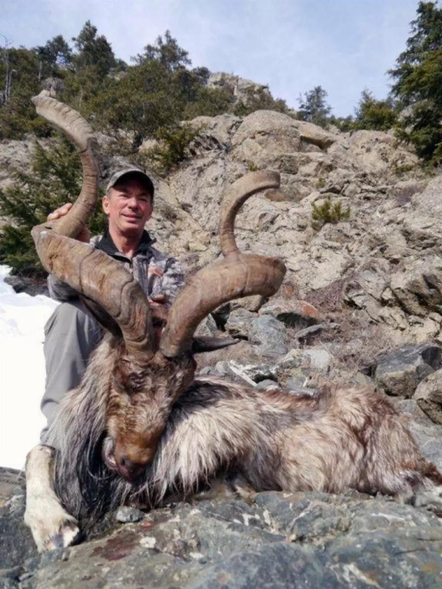 Ο John Amistoso ποζάρει με ένα Sulaiman markhor (διαφορετικό υποείδος) που σκότωσε τον Ιανουάριο του 2017 στο Πακιστάν