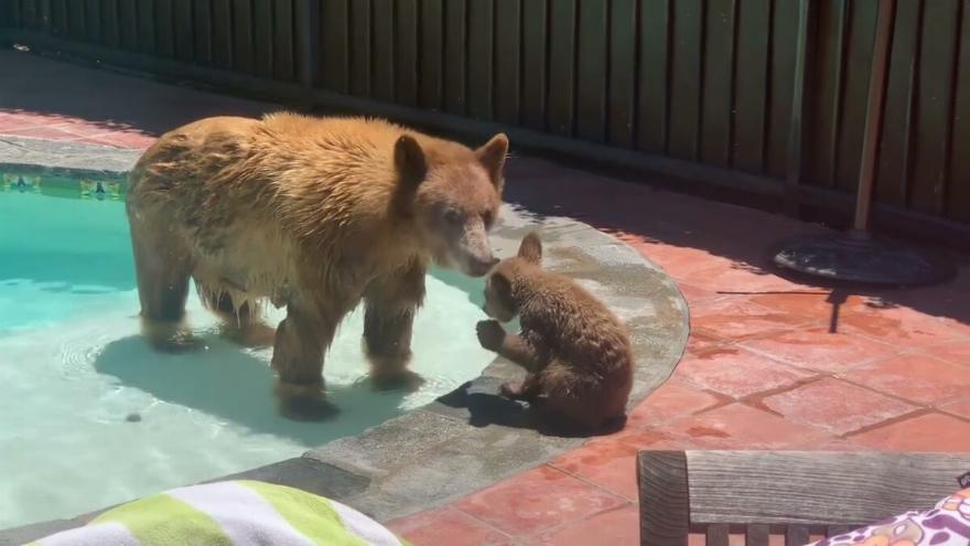 Σε ένα βίντεο, μια μαμά αρκούδα παίρνει τα δύο μικρά της στην πισίνα για μια δροσερή βουτιά