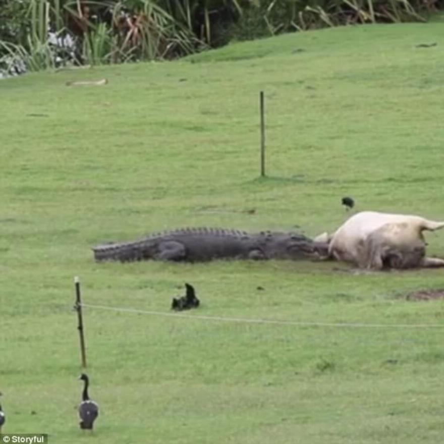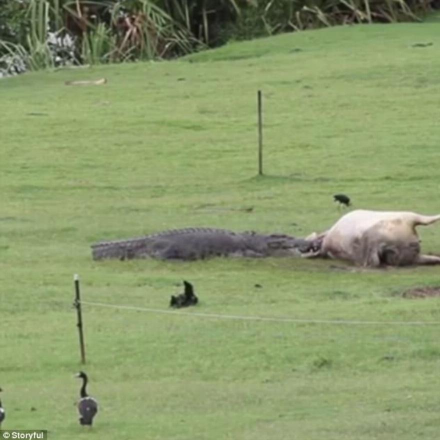 Στο βίντεο ο κροκόδειλος φαίνεται που κατατρώει την αγελάδα, ενώ πολλά πουλιά παρακολουθούν.