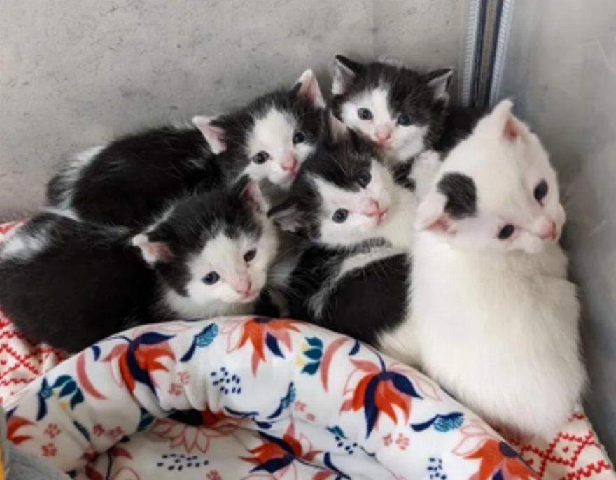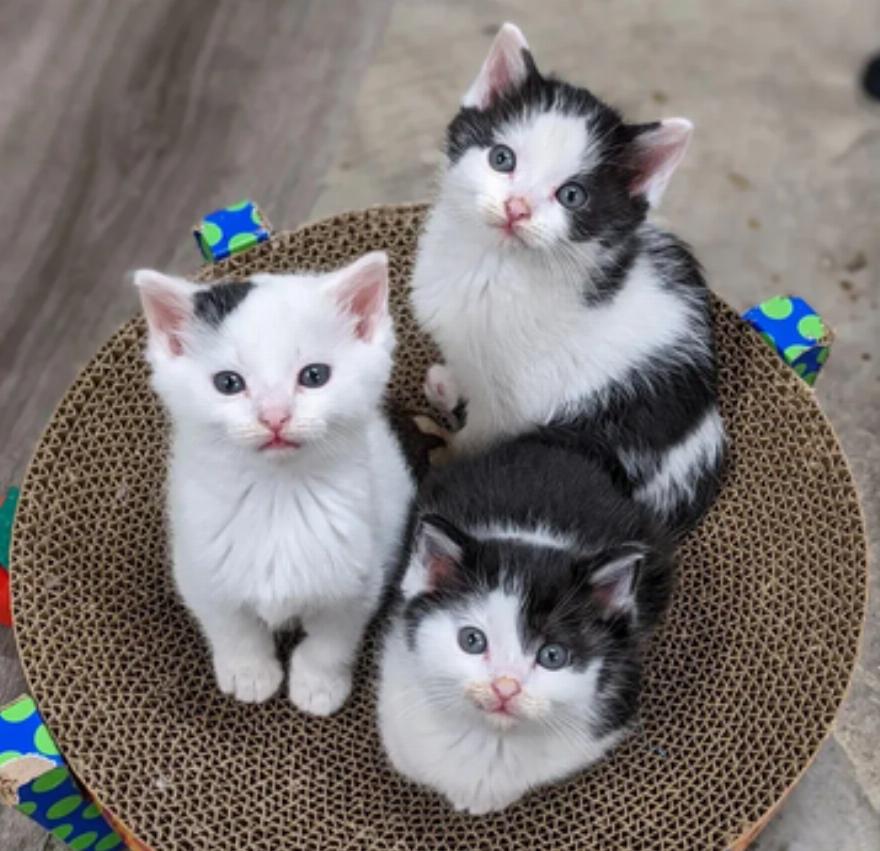 Τα γατάκια ήταν περίπου τεσσάρων εβδομάδων και όλα είχαν ασπρόμαυρα σημάδια που μοιάζουν με αυτά της αγελάδας. Ήταν πολύ ντροπαλά και στριμωγμένα σε μια γωνιά του δωματίου της ανάδοχης οικογένειάς τους, προσπαθώντας να κρατήσουν το ένα το άλλο ασφαλές.