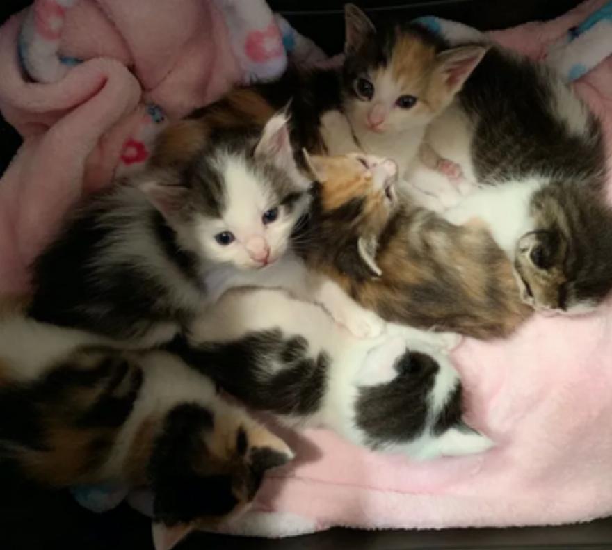 Τα αξιολάτρευτα γατάκια Cookies and Cream (CC) και η Caramel (Cara) βρέθηκαν μαζί με τα τέσσερα αδέρφια τους σε ένα πάρκινγκ.