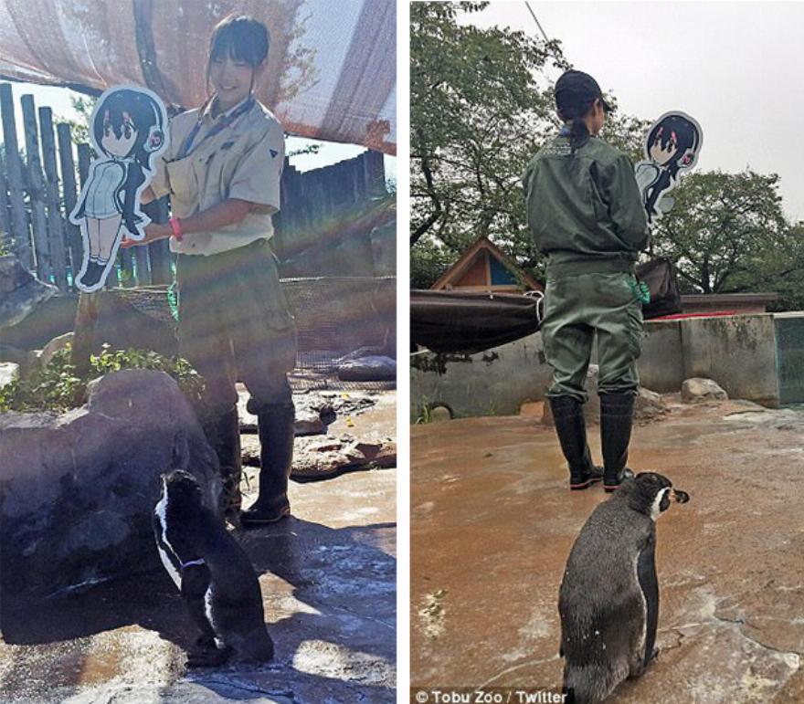 O πιγκουίνος ερωτεύτηκε την χάρτινη φιγούρα της κοπέλας στον ζωολογικό κήπο Τομπού στην πόλη Μιγιασίρο κατά την διάρκεια μια διαφημιστικής εκστρατείας τον Απρίλιο.