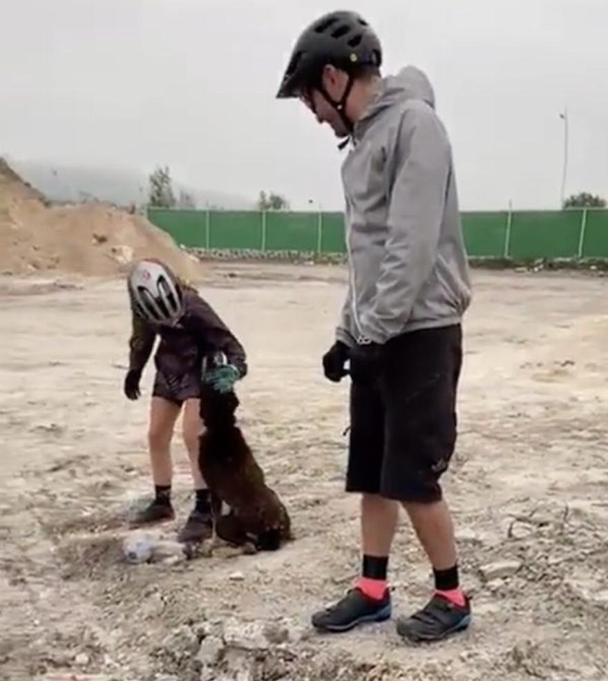 Στο βίντεο που κοινοποιήθηκε στα μέσα κοινωνικής δικτύωσης, η ομάδα των ποδηλατών πλησιάζει τον σκύλο, το κεφάλι του οποίου είναι εντελώς καλυμμένο με ένα βρώμικο, πεταμένο πλαστικό μπουκάλι. Ο άνδρας πασχίζει να αφαιρέσει το μπουκάλι, αλλά μια νεαρή κοπέλα έρχεται να τον βοηθήσει και κρατάει τον σκύλο ενώ εκείνος ξεφλουδίζει το πλαστικό για να ελευθερώσει τον σκύλο.