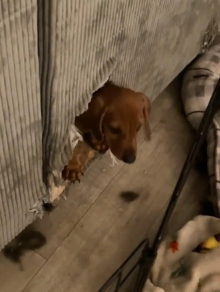 Ειλικρινά έχουμε τόσες πολλές απορίες για το πώς αυτό το μικροσκοπικό κουτάβι μάσησε τον καναπέ. Μήπως κατάφερε με κάποιο τρόπο να ξεφύγει από το κλουβί; Πώς ήξερε το κουτάβι να κάνει μια τρύπα στον καναπέ για τη δική του ιδιωτική κρυψώνα; Το μόνο που ξέρουμε είναι ότι αυτή η οικογένεια θα τα βρει σκούρα, καθώς έχει ήδη στα χέρια της έναν πολύ μεγάλο ταραχοποιό.