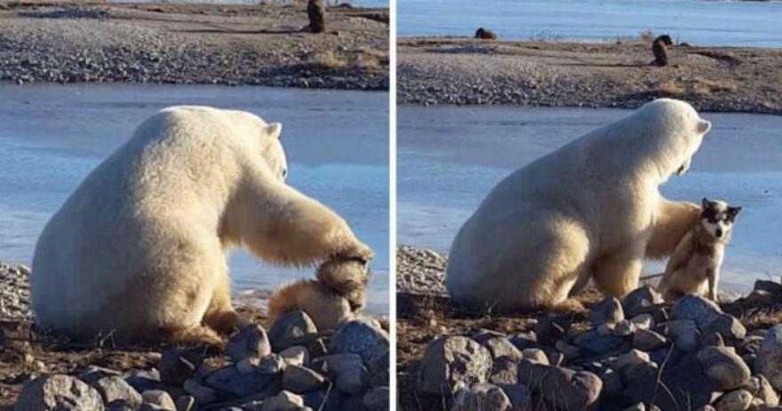 Η πολική αρκούδα που εντόπισε και πλησίασε έναν δεμένο σκύλο, φαίνεται πως είχε φιλικές διαθέσεις και κατεγράφη να τον «χαϊδεύει» με το πόδι της.