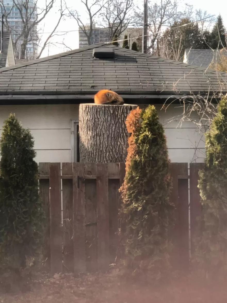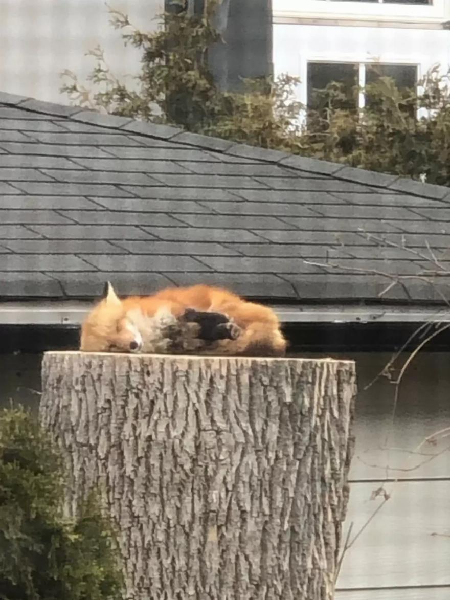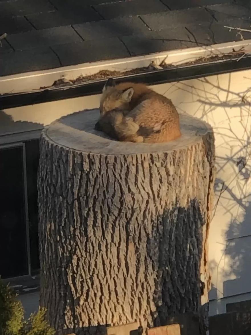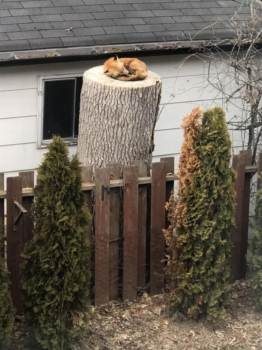 Προφανώς, η ζεστή μικρή αλεπού ένιωθε ασφαλής στον ύπνο της, σκαρφαλωμένη στην κορυφή του ψηλού κούτσουρου.
