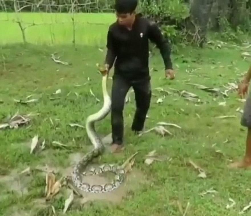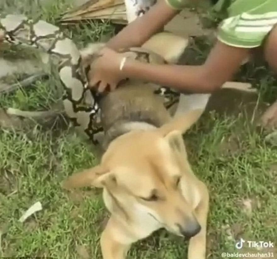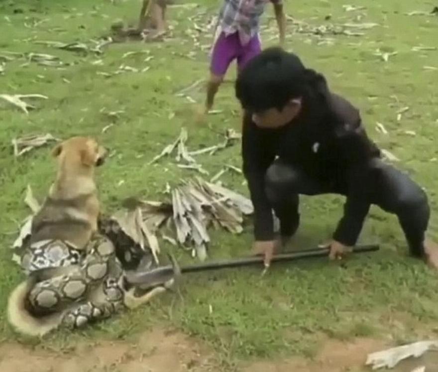 Όπως φαίνεται στο βίντεο τα δύο μικρότερα αγόρια πετούν με θάρρος φύλλα στο φίδι σε μια προσπάθεια να το κάνουν να αφήσει τον σκύλο τους. Εν τω μεταξύ, το μεγαλύτερο παιδί προσπαθεί να καθηλώσει το κεφάλι του φιδιού χρησιμοποιώντας κάτι που φαίνεται να είναι ένα μεταλλικό πόδι τραπεζιού.