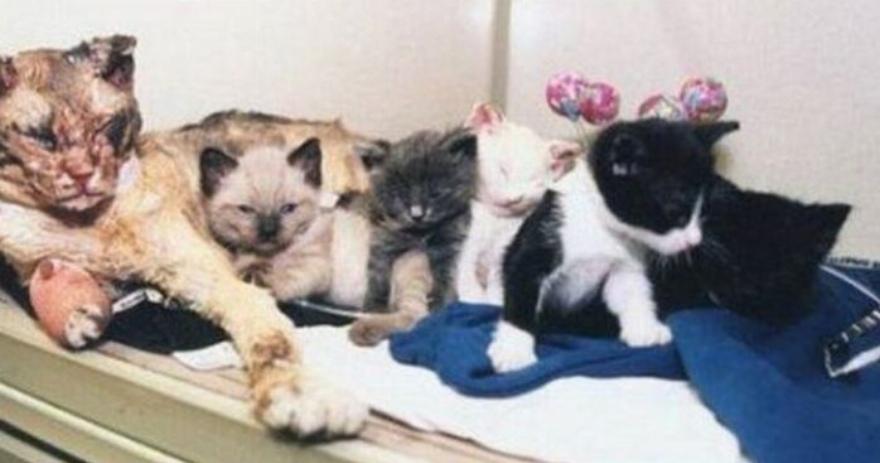 Πρόκειται για την πιο ηρωική αδέσποτη γάτα του κόσμου η οποία πήδηξε στη φωτιά πέντε φορές για να σώσει τα πέντε μωρά της από πυρκαγιά που ξέσπασε σε ένα εγκαταλελειμμένο γκαράζ.