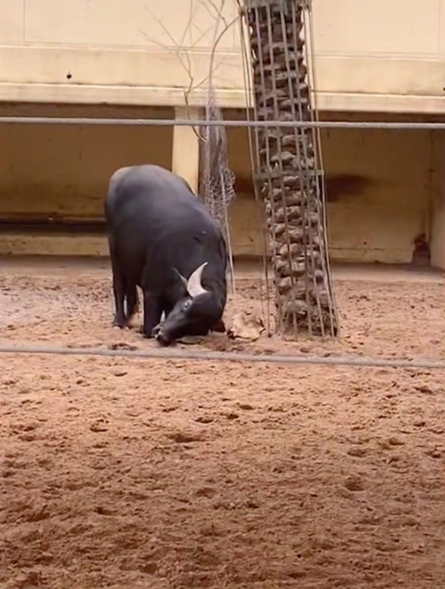 Έτσι, το μεγάλο ζώο προσπάθησε να γυρίσει τη χελώνα με τα κέρατά του. Χρειάστηκαν μερικά δευτερόλεπτα, αλλά τελικά τα κατάφερε και κατάφερε να επαναφέρει τον φίλο του στην αρχική του θέση.