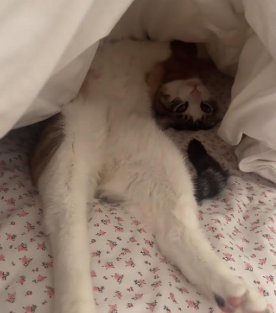 “Νομίζω ότι νομίζει ότι είναι έξω και σκοτώνει αρουραίους ή σκαρφαλώνει σε δέντρα ή ξέρεις, ό,τι άλλο έχει να κάνει με γάτες. Δεν ξέρει ότι του έχω μάθει τρία διαφορετικά κόλπα. Κοιμάται μαζί μου κάθε φορά που παίρνω έναν υπνάκο”, εξηγεί στο βίντεο.