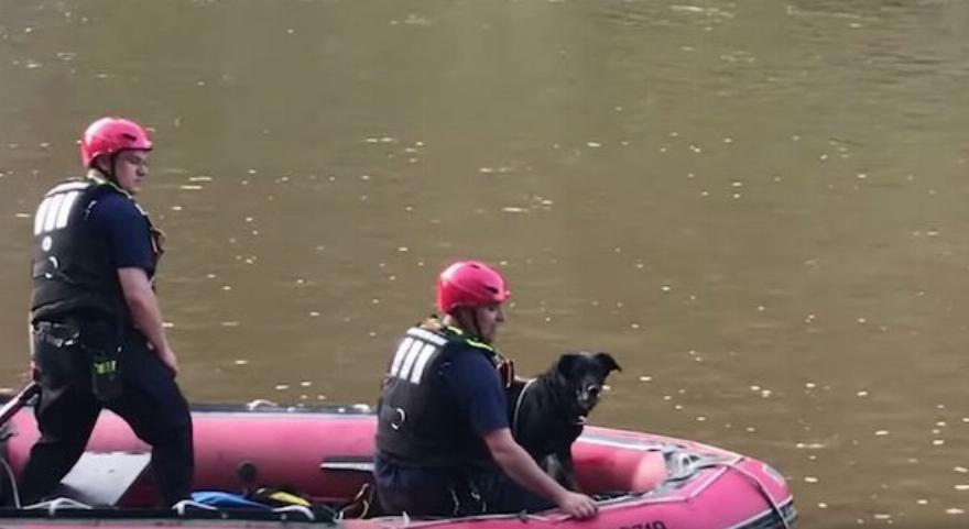 Τα συνεργεία εφοδίασαν μια αυτοσχέδια ιμάντα προκειμένου να ασφαλίσουν σωστά τον σκύλο και να τον τραβήξουν με βαρούλκο σε ασφαλές σημείο. Αντί να τον τραβήξουν προς τα πάνω, κατέβασαν τον σκύλο σε μια βάρκα που περίμενε στο ποτάμι από κάτω.