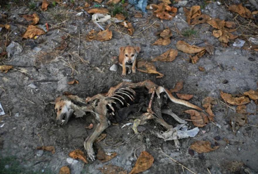 Ένας τεράστιος σκύλος που έχει πεθάνει εδώ και μερικές ημέρες και τώρα είναι μόνο σκελετός και δέρμα κάθεται δίπλα σε ένα κουτάβι.