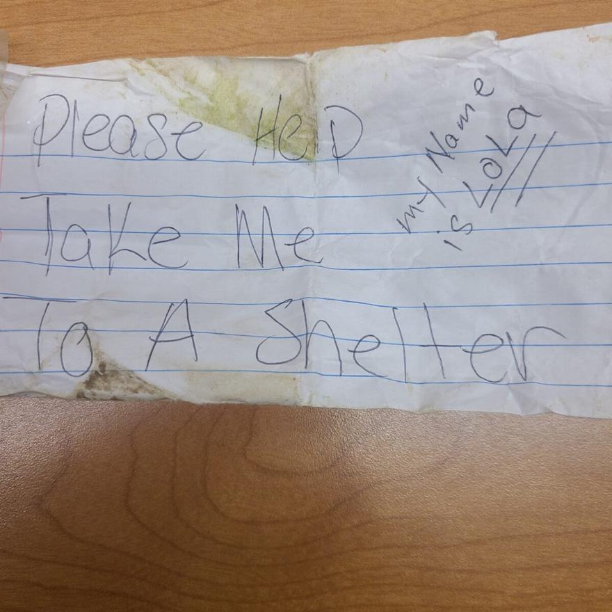 Το σημείωμα γράφει: “Παρακαλώ βοηθήστε με. Πάρτε με σε ένα καταφύγιο. Το όνομά μου είναι Λόλα“.