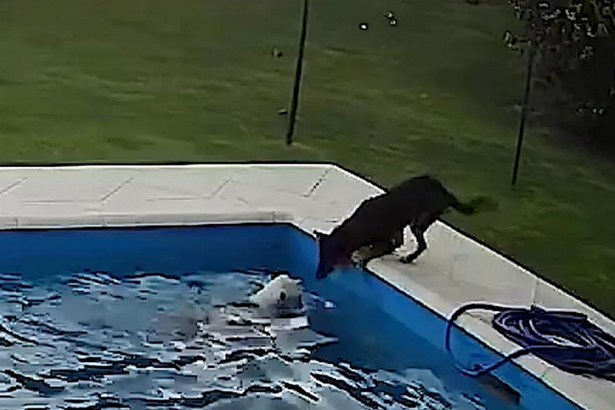 “Και τότε, όταν η Λούνα φτάνει κοντά στην άκρη, η Caipirinha την σπρώχνει προς τις σκάλες, γνωρίζοντας ότι αυτός θα ήταν ο μόνος τρόπος για να βγει”, ακούγεται να λέει ο Dustin στο βίντεο που μοιράστηκε η Sassy στο Facebook. Η Caipirinha φτάνει στο σημείο να τραβήξει το κολάρο της Luna μόλις αυτή βρεθεί στα σκαλιά για να τη βοηθήσει να βγει από την πισίνα για το υπόλοιπο της διαδρομής.