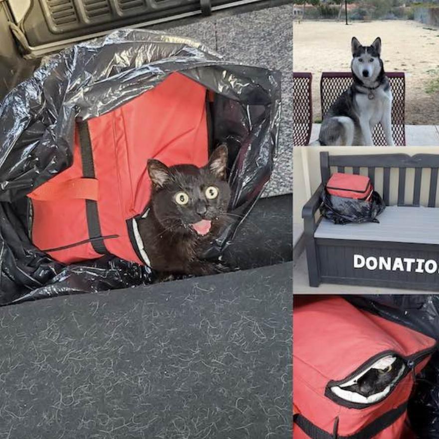 Ο Koda δεν σταματούσε να μυρίζει την τσάντα, οπότε η κηδεμόνας του Koda άνοιξε το φερμουάρ και σοκαρισμένη είδε ένα ζευγάρι κίτρινα μάτια να την κοιτάζουν. Μια μαύρη γάτα, ευτυχώς ζωντανή, βρισκόταν μέσα!