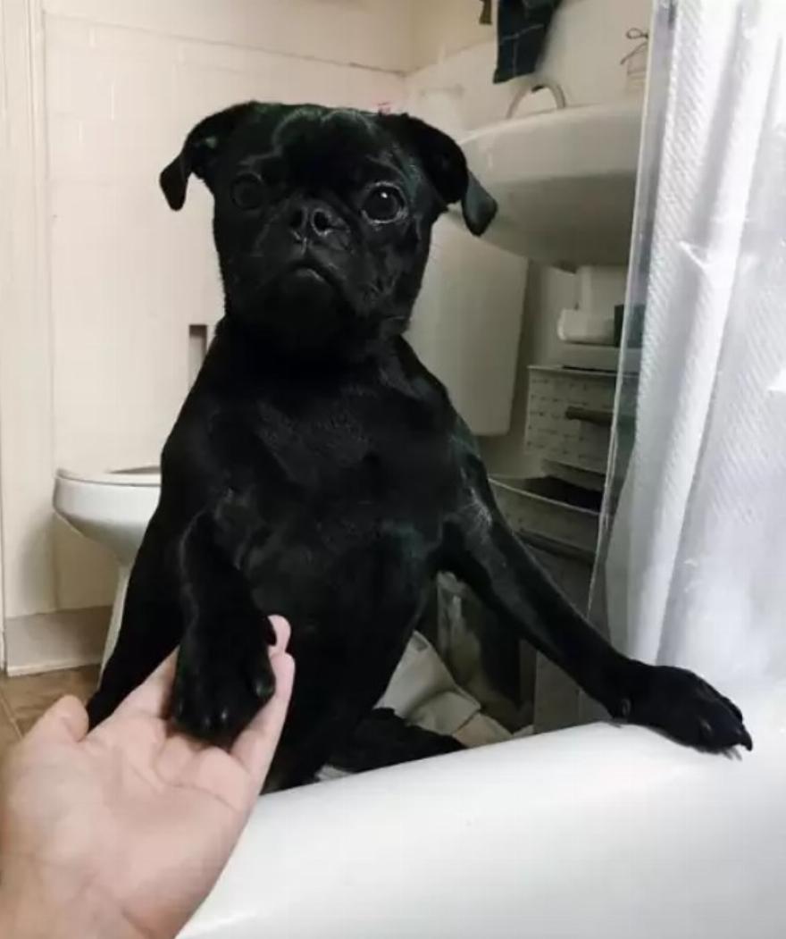 Το σκεπτόμενο κουτάβι σαφώς θα προτιμούσε να είναι μακριά από το κακό μπάνιο, αλλά μένει ούτως ή άλλως δίπλα του – και όλα αυτά για να μην χρειάζεται η μαμά του να το αντιμετωπίσει μόνη της.