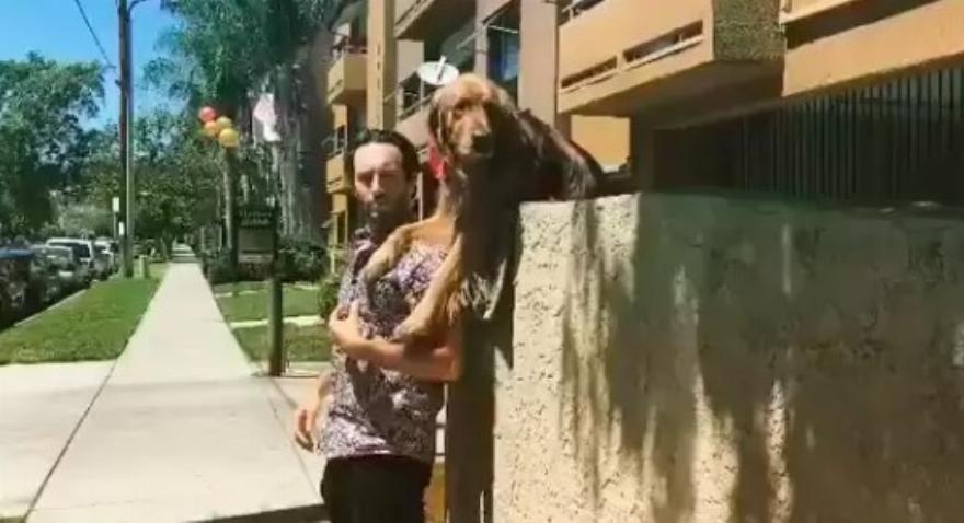Ο John Berchtold, ο οποίος δημοσίευσε πρόσφατα ένα βίντεο με τον Riley στο Twitter, επισκέφθηκε απλώς κάποιους φίλους στη γειτονιά όταν εντόπισε τον Riley να κρέμεται πάνω από τον τοίχο και αμέσως γοητεύτηκε από τον αξιολάτρευτο, αναζητούντα την προσοχή σκύλο.