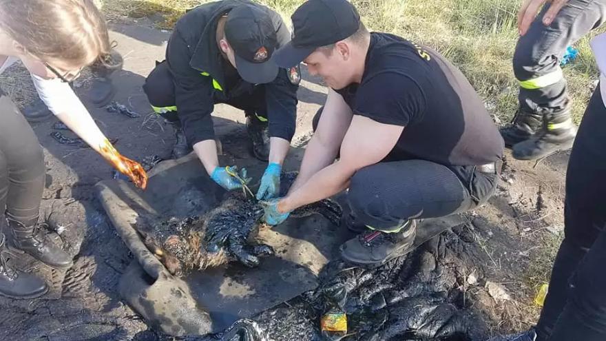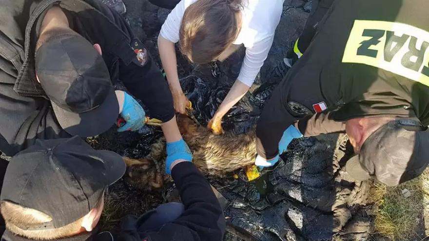 Οι διασώστες έκοψαν προσεκτικά τα πιο προσκολλημένα στην πίσσα τμήματα της γούνας του φτωχού σκύλου και χρησιμοποίησαν μαγειρικό λάδι για να χαλαρώσουν τα υπόλοιπα.