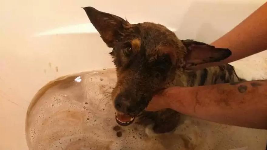 Ο σκύλος μεταφέρθηκε εσπευσμένα σε κτηνιατρική κλινική για να αντιμετωπιστεί η εξάντληση και να απομακρυνθεί όσο το δυνατόν περισσότερο από την εναπομείνασα πίσσα από το σώμα του.