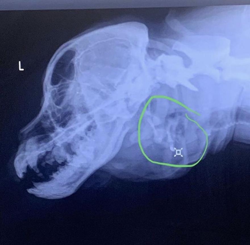 Κάναμε κι άλλες ακτινογραφίες του κρανίου της Toad. Τώρα που έχουμε τη Toad για μεγάλο χρονικό διάστημα και μάθαμε για τα προβλήματά της περισσότερα από ό,τι όταν την πρωτογνωρίσαμε, είμαστε σε θέση να κατανοήσουμε τις ακτινογραφίες λίγο καλύτερα. Η πρώτη εικόνα δείχνει πόσο παράξενο είναι το σχήμα του κρανίου της. Έχει ένα επιπλέον τροχιακό οστό γύρω από την κόγχη των ματιών της, πιθανότατα από το κρανίο του δίδυμου που απορρόφησε στη μήτρα, το οποίο κάνει το κρανίο της πολύ βολβοειδές. Ο κόκκινος κύκλος δείχνει δύο σετ υοειδών οστών. Το κίτρινο δείχνει ότι οι σπόνδυλοι δεν είναι συνδεδεμένοι όπως θα έπρεπε. Ο πράσινος κύκλος δείχνει την επιπλέον τραχεία της, η οποία δεν έχει σχηματιστεί πλήρως.