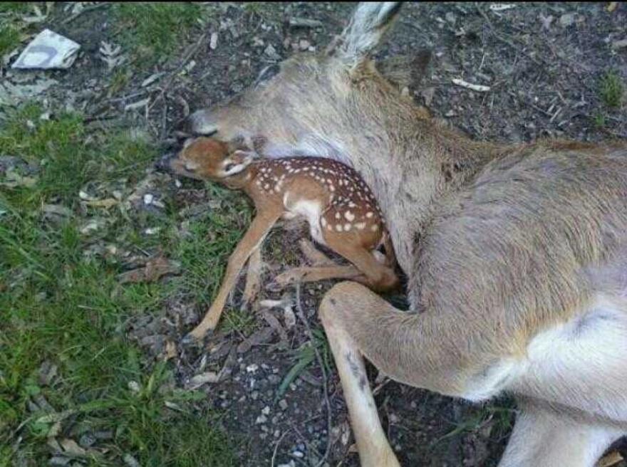 Αυτό το ελάφι στεκόταν δίπλα στο σώμα σαν να περίμενε να ξυπνήσει η μητέρα. Αυτό συγκίνησε βαθιά τους διασώστες που δεν μπορούσαν παρά να αγανακτήσουν για την συμπεριφορά των οδηγών και την αναισθησία τους να βοηθήσουν το άτυχο ελάφι.