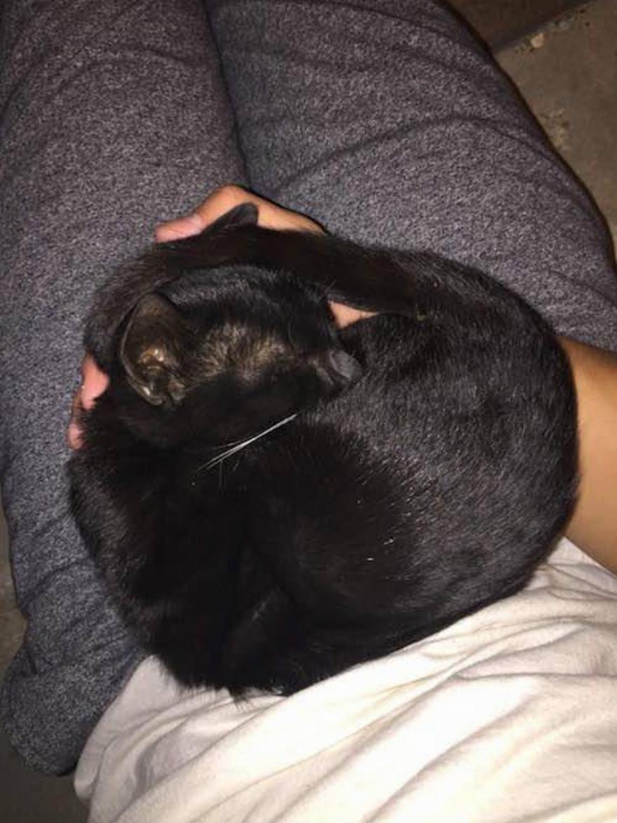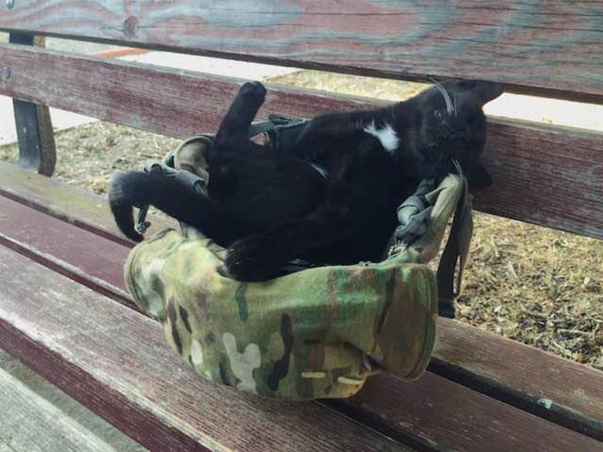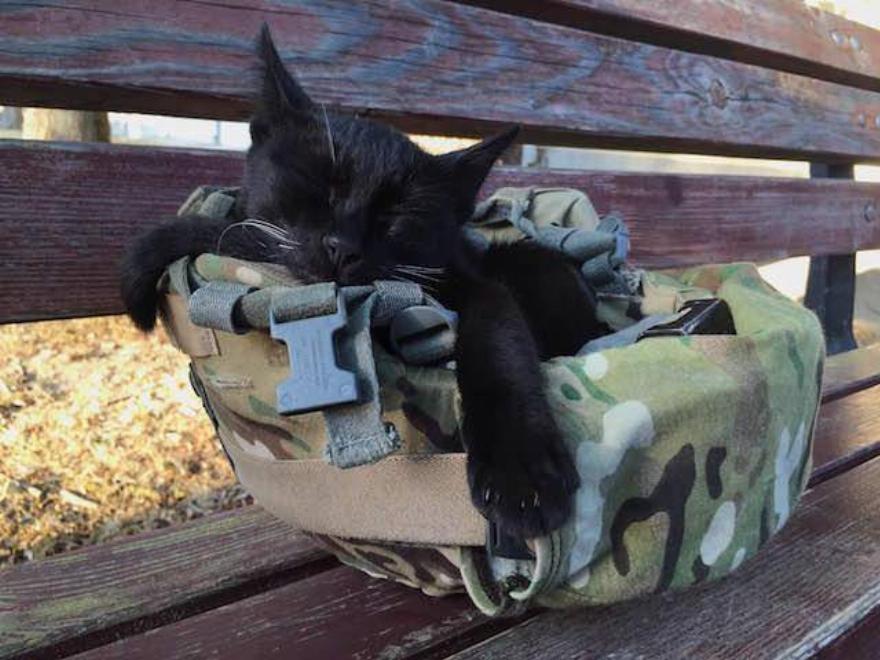 Σε μια ημιεγκαταλελειμμένη εγκατάσταση, “πήρα αυτό το γατάκι πριν από μερικές εβδομάδες και το έφερα στο στρατώνα όπου μένουμε”, είπε. Το γατάκι δέθηκε αμέσως με τον νέο αγαπημένο του άνθρωπο. Απολαμβάνει να κοιμάται στο κράνος του στρατιώτη, το οποίο είναι ό,τι πιο κοντινό είχε ποτέ σε κρεβάτι.