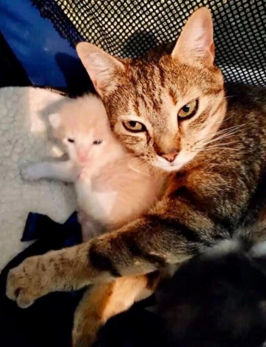 Όταν ένας υπάλληλος του καταφυγίου τοποθέτησε προσεκτικά το πρώτο μωρό στο κρεβάτι της Toodles, η μαμά γάτα μύρισε το μικρό γατάκι και νιαούρισε από χαρά. Τα υπόλοιπα γατάκια, που ήταν περίπου 2 εβδομάδων, σκαρφάλωσαν πάνω στη μαμά τους αφήνοντας μικροσκοπικά τσιριχτά και άρχισαν να θηλάζουν.