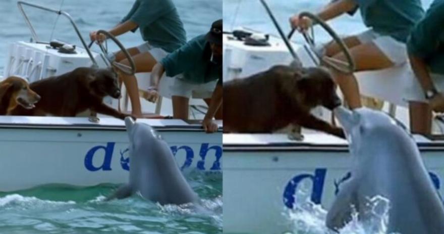 Το δελφίνι σε αυτό το βίντεο, βλέπει ένα ζευγάρι σκύλων πάνω σε ένα σκάφος. Δεν είναι σαφές αν το δελφίνι ήταν συγκινημένο ή ήταν απλά περίεργο! Το δελφίνι αναδύεται από το νερό για να δώσει ένα φιλί στη μύτη του ενός σκύλου. Και ο σκύλος όμως ανταπέδωσε και φίλησε ο ένας τον άλλον!