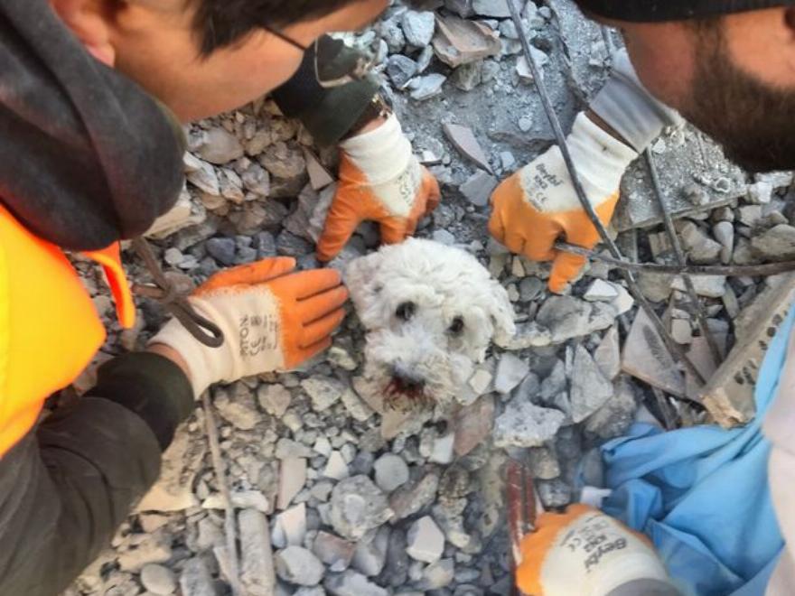 Πλάνα από τη διάσωση δείχνουν το κεφάλι του λευκού σκύλου να προεξέχει από τα συντρίμμια καθώς οι διασώστες προσπαθούν να τον απελευθερώσουν.