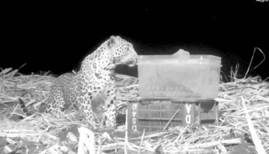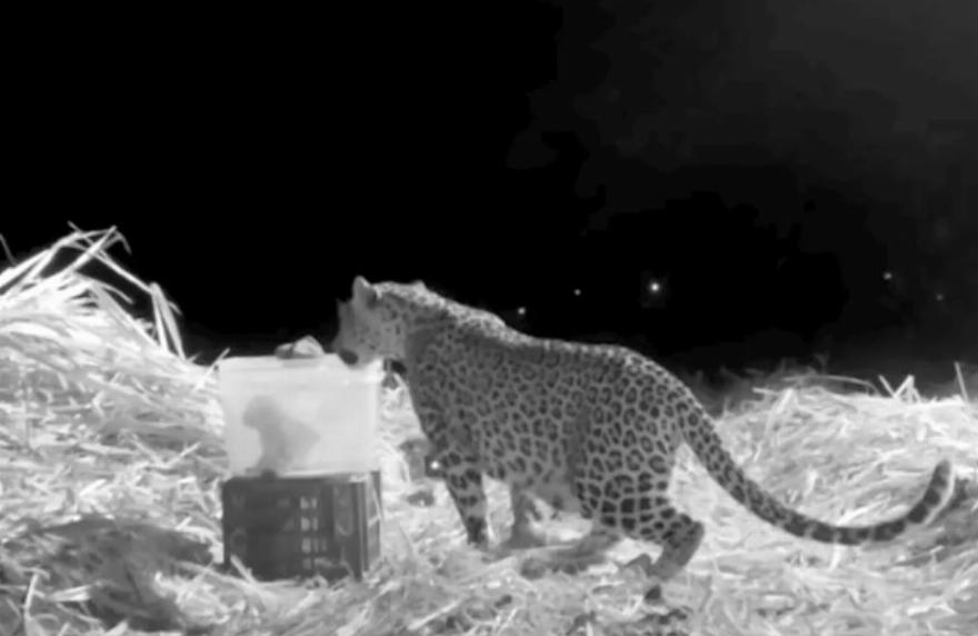 Στα πλάνα φαίνεται η λεοπάρδαλη να σταματά ξαφνικά όταν συνειδητοποιεί ότι κάτι βρίσκεται στο πλαστικό κουτί στο χωράφι.