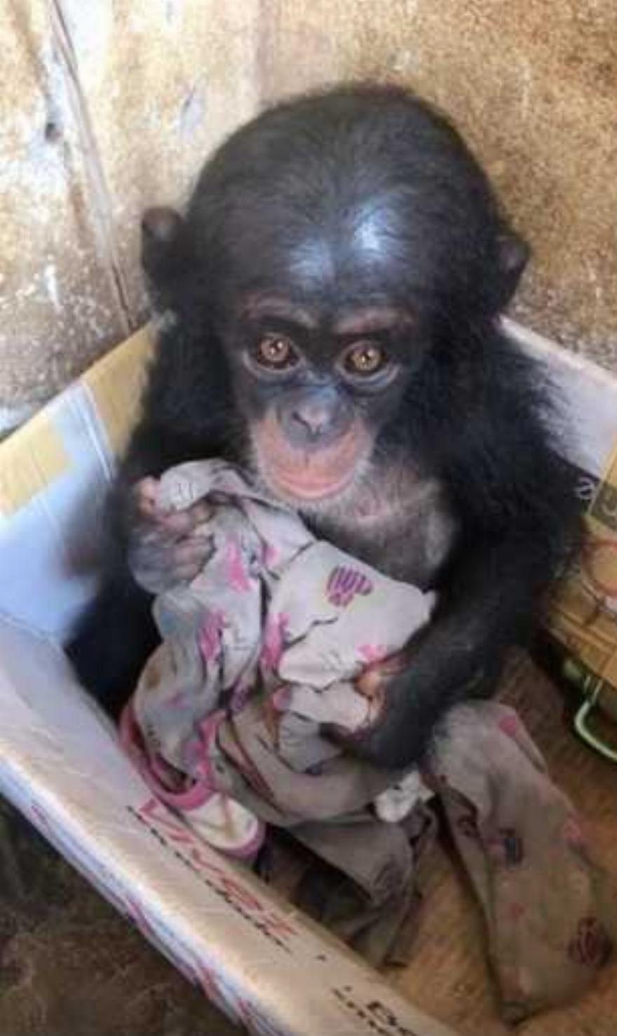 Το Liberia Chimpanzee Rescue And Protection έλαβε ένα ανώνυμο τηλεφώνημα και έκανε έφοδο σε ένα κατάστημα στην Kakata της Λιβερίας, για να βρει ένα μικροσκοπικό μωρό χιμπατζή μέσα σε ένα κουτί από χαρτόνι.