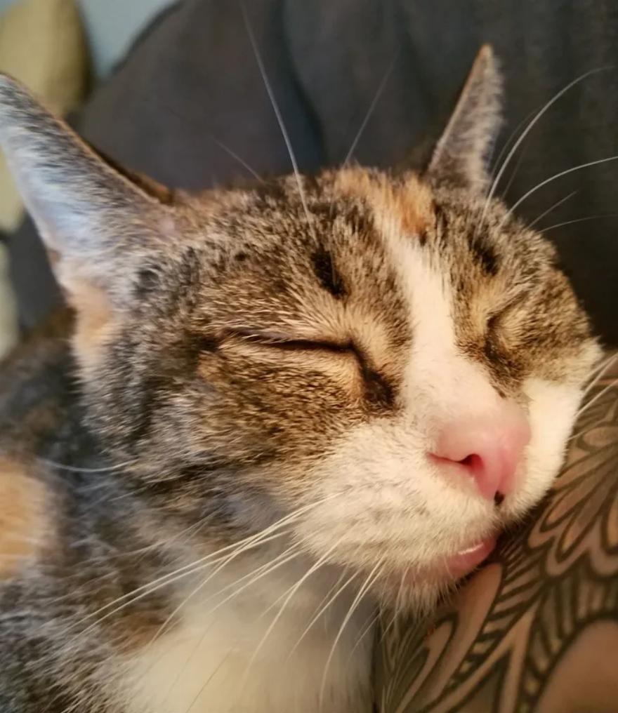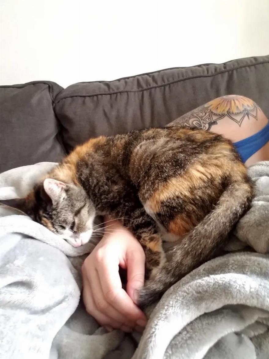 Η γλυκιά γατούλα συνειδητοποίησε ότι ήταν επιτέλους σπίτι της. “Από τότε, κοιμάται όλη τη νύχτα (ακριβώς δίπλα μου και μερικές φορές μοιράζεται το μαξιλάρι μου)”, είπε η Bridgid.