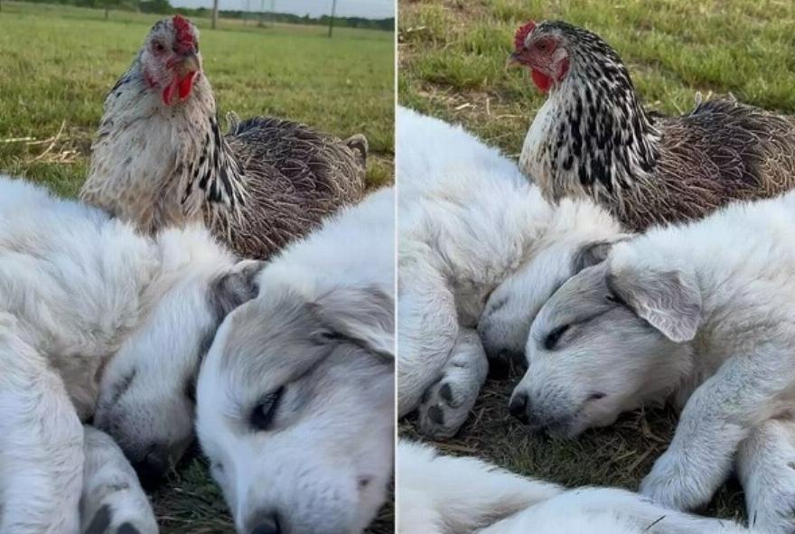 Η κότα της Tracie Hale, Harriet, με μερικά από τα 10 κουτάβια της Great Pyrenees.