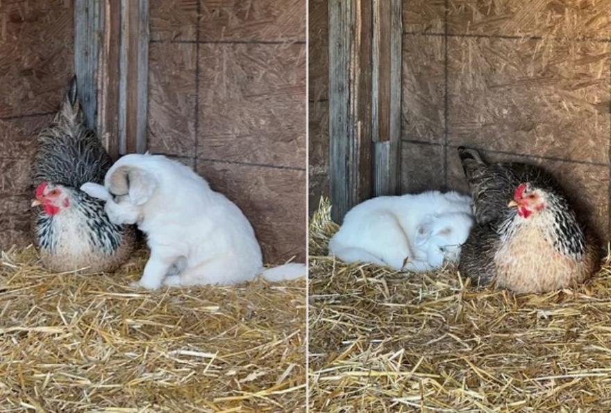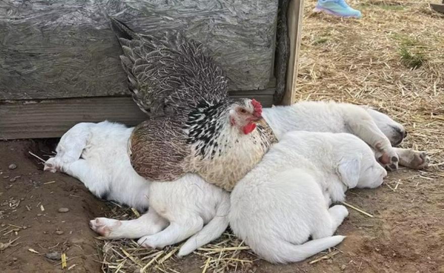 Η κότα, η Χάριετ, συνέχισε να φωλιάζει σαν να υποδεχόταν νεοσσούς, και όταν η Λούσι, ο σκύλος, υποδέχτηκε κουτάβια, η Χάριετ έγινε μητέρα των 10 μωρών