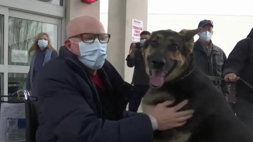 Ήταν μια συναισθηματική επανένωση καθώς ο 6χρονος γερμανικός ποιμενικός Sadie έπεσε στην αγκαλιά του Brian Myers καθώς έβγαινε από το κέντρο αποκατάστασης, εβδομάδες αφότου βοήθησε να σωθεί η ζωή του κατά τη διάρκεια ενός ιατρικού επεισοδίου στη μέση της νύχτας