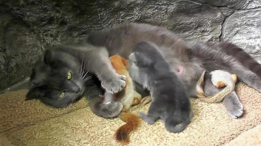 Ο κάτοικος του πάρκου, μια γάτα με το όνομα Pusha, είχε μόλις γεννήσει μια γέννα τεσσάρων γατάκια. Έτσι, οι υπάλληλοι του πάρκου αποφάσισαν να δουν αν η Pusha θα δεχόταν τα μωρά των σκίουρων ως δικά της. Άλλωστε, τα μωρά σκίουροι μερικές φορές αποκαλούνται “κιτ” ή “γατάκια”!