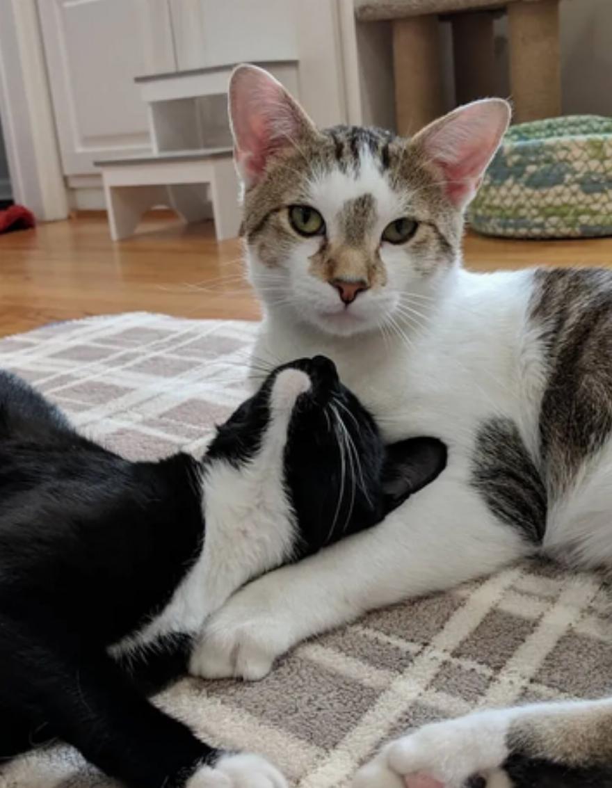 Καθώς περίμεναν υπομονετικά, τα δύο γατάκια συνέχισαν να λούζουν το ένα το άλλο με αγάπη